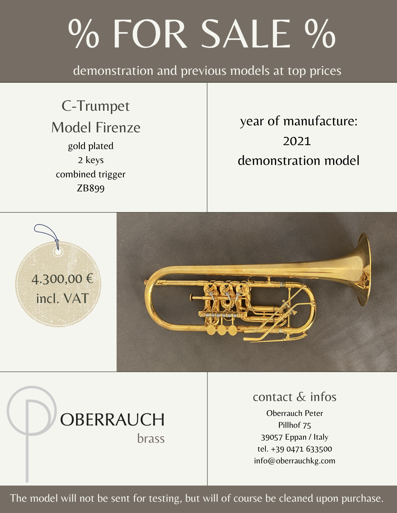 The c-trumpet, model Firenze, with Zirnbauer-valves (ZB 899) is gold plated and has 2 claps and one combined trigger. The price is about 4.300 Euro VAT included.